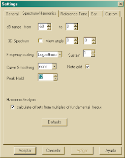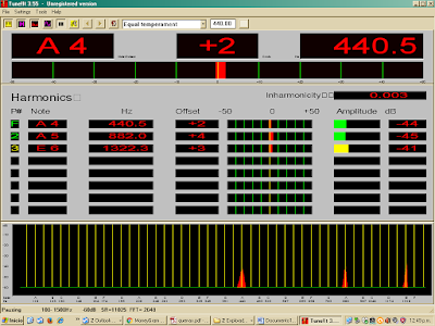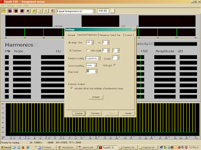 En el cuadro “Harmonics”, se muestran los modos de vibración, su valor en frecuencia, el Offset respecto al 440Hz (en números y barras), y la amplitud de cada armónico (en dB relativos)