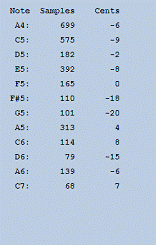 Arriba: Gráfica del Flutini para la grabación a 445 Hz. La mayoría de las notas registran valores por encima del 440Hz (barras a la derecha de la gráfica)